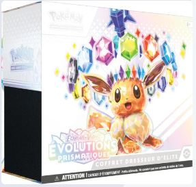 Coffret Dresseur d'élite Écarlate et Violet – Évolutions Prismatiques : contenant 9 boosters Écarlate et Violet – Évolutions Prismatiques, une carte promo au style « illustration rare » d'Évoli, et des accessoires de jeu divers.