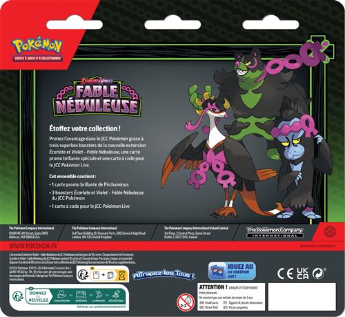 Prenez l'avantage dans le JCC Pokémon grâce à trois superbes boosters de la nouvelle extension Écarlate et Violet – Fable Nébuleuse, une carte promo brillante spéciale et une carte à code pour le JCC Pokémon Live. Pêchaminus, découvert dans le DLC Le trésor enfoui de la Zone Zéro des jeux vidéo Pokémon Écarlate et Pokémon Violet, fera ses débuts dans l'extension Écarlate et Violet – Fable Nébuleuse en tant que Pokémon de type Obscurité.